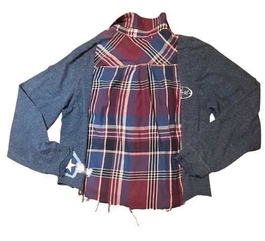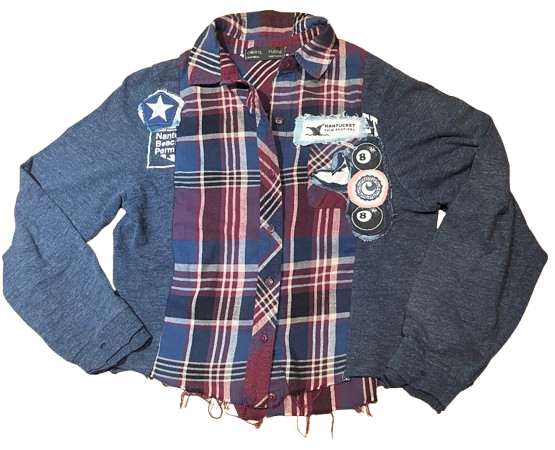 Small/Medium - Red and grey soft vintage flannel with black leather pocket, silver stitched leather star and silver leather accent frayed vintage denim.
