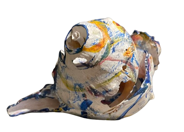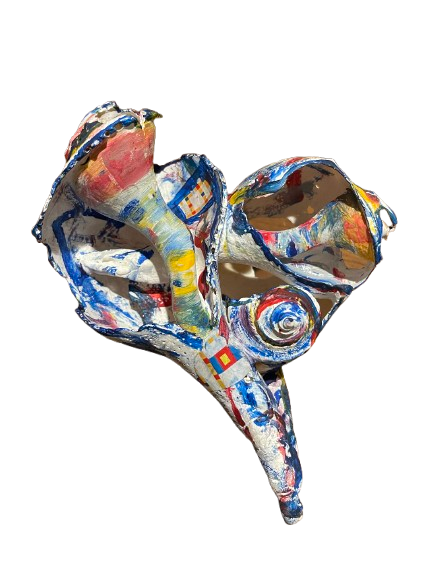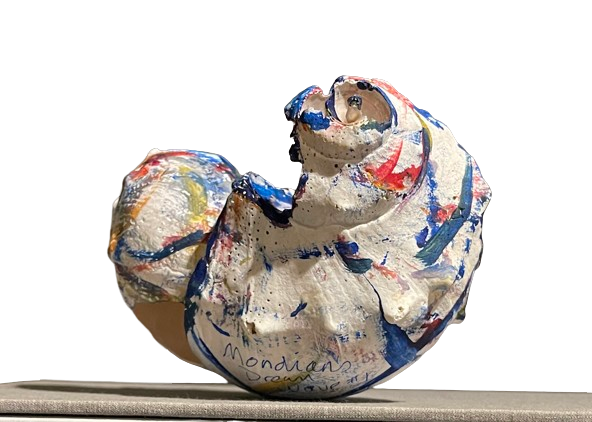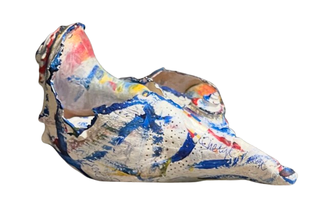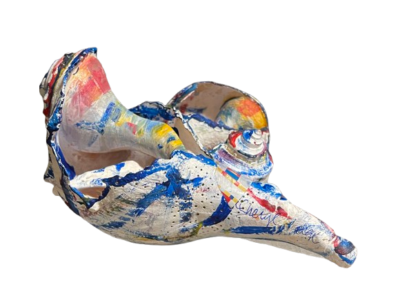 MONDRIAN’S WAVE is a striking fusion of natural form and modern design. This shell sculpture, created from meticulously arranged Nantucket Welk shells, captures a rhythmic flow in every curve and placement. The sculpture was inspired by Piet Mondrian’s Broadway Boogie Woogie. Cheryl Fudge’s unique painting style introduces a sense of urban energy to the natural medium, creating a dynamic contrast between the peaceful nature of the ocean and the vibrant abstraction of modern art.