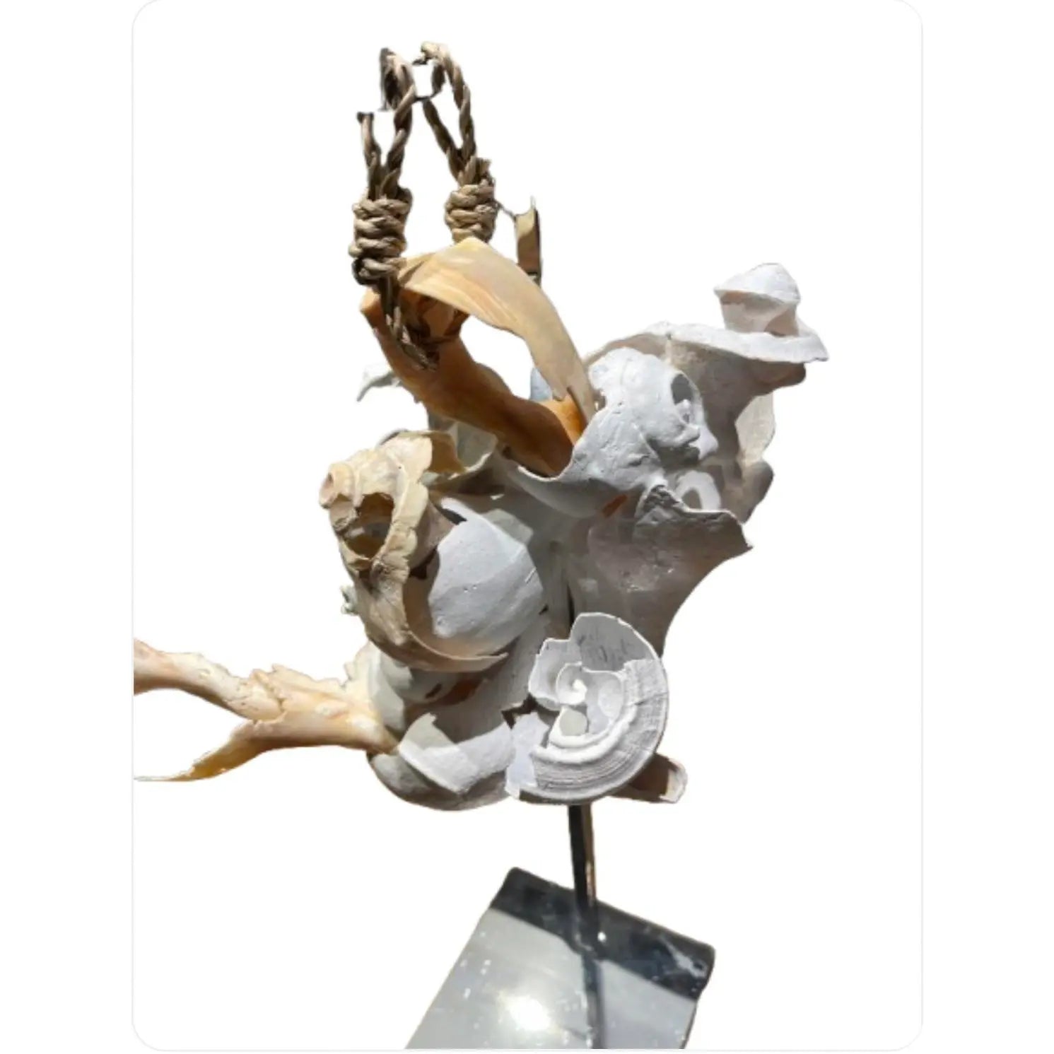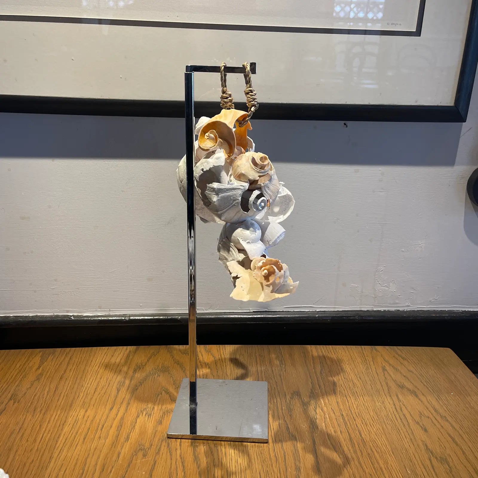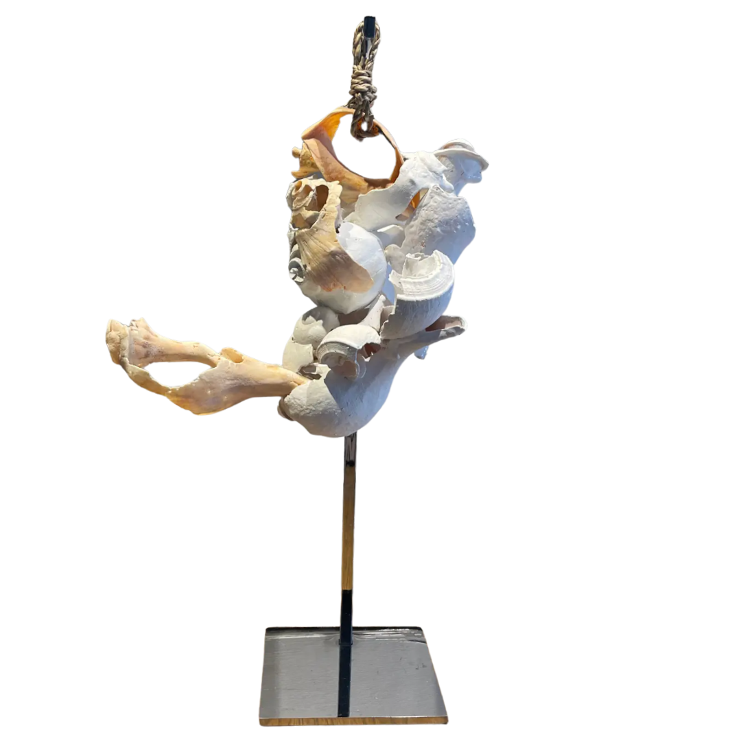 The shells are arranged in a puzzle-like composition that suggests quiet movement—an interplay between nature’s rhythm and precise, intentional craftsmanship. Suspended from a hand-knotted nautical rope and grounded by a sleek chrome stand, the sculpture strikes a balance between coastal character and modern minimalism.