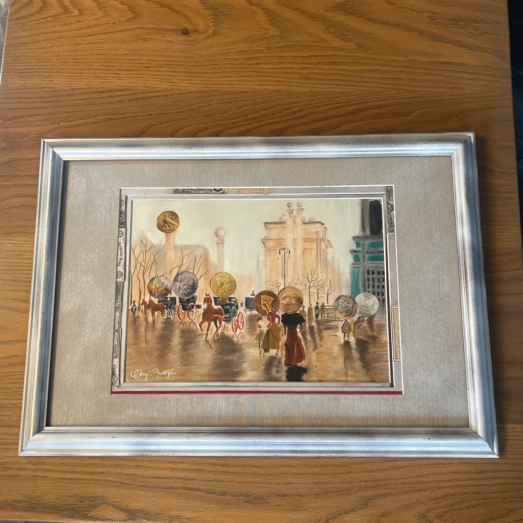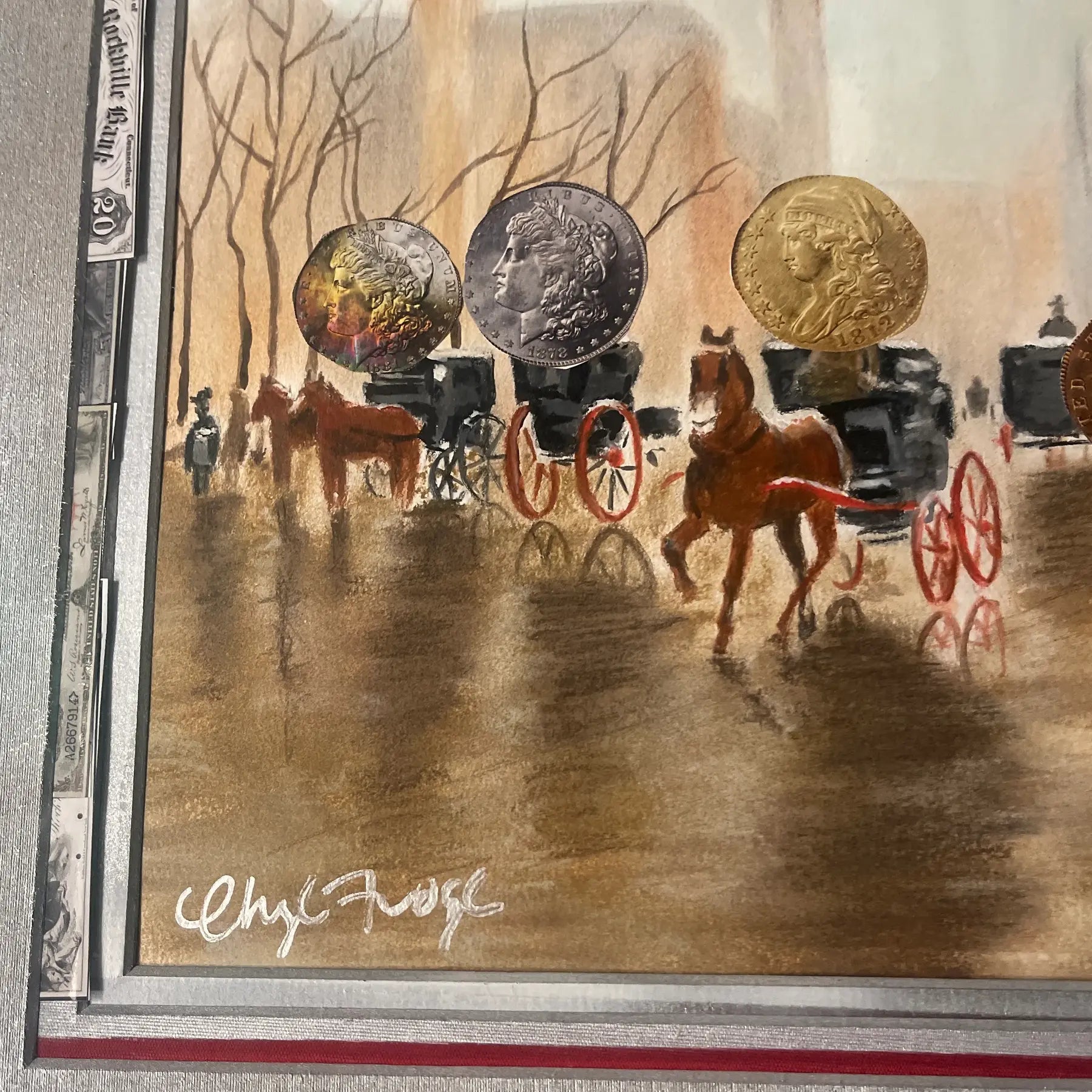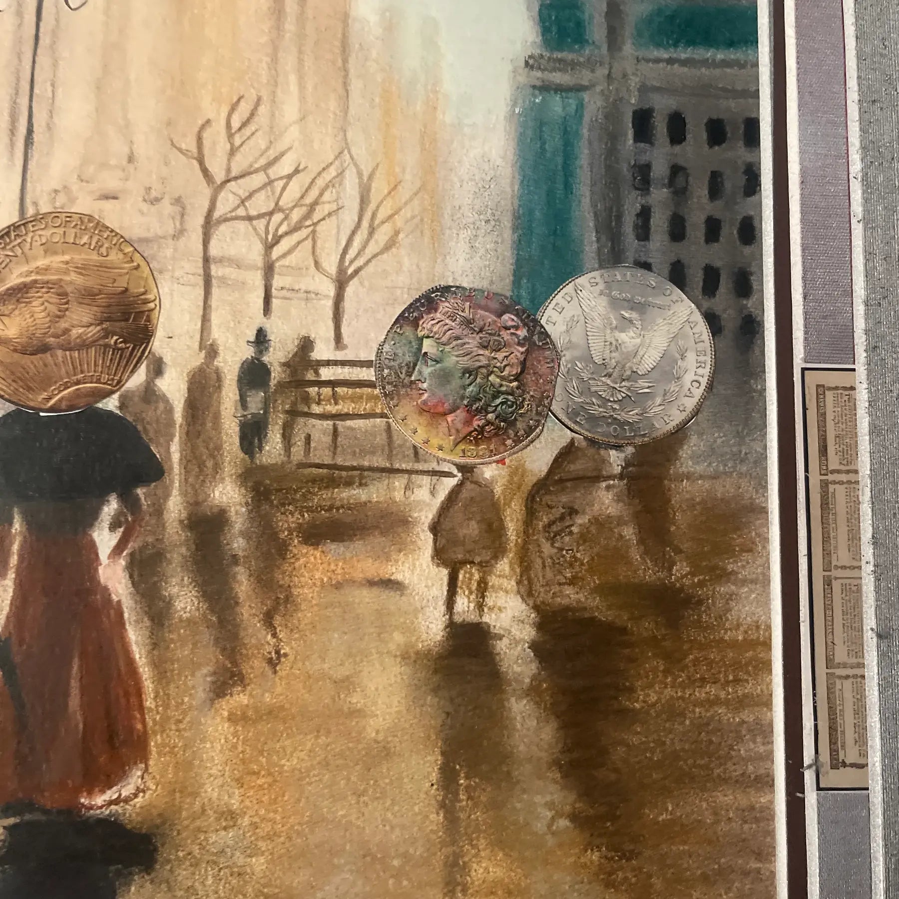 Surrounding the scene, hand-painted matting and decoupaged vintage paper money frame the piece in the very instruments of economic control and manipulation. The silver-sprayed vintage frame connects eras—reflecting how today’s political shifts are echoes of the past, retold through new policies that threaten shared progress.