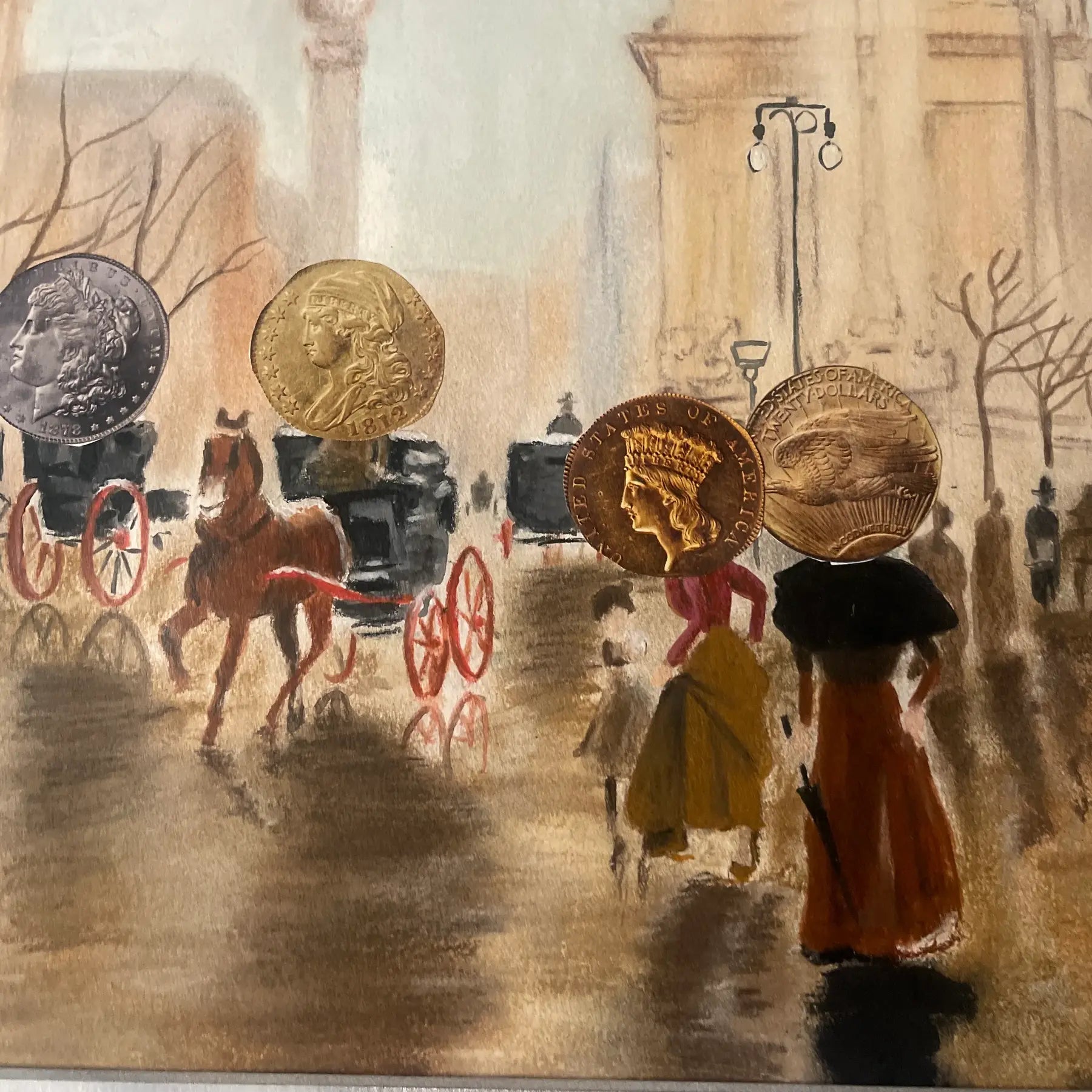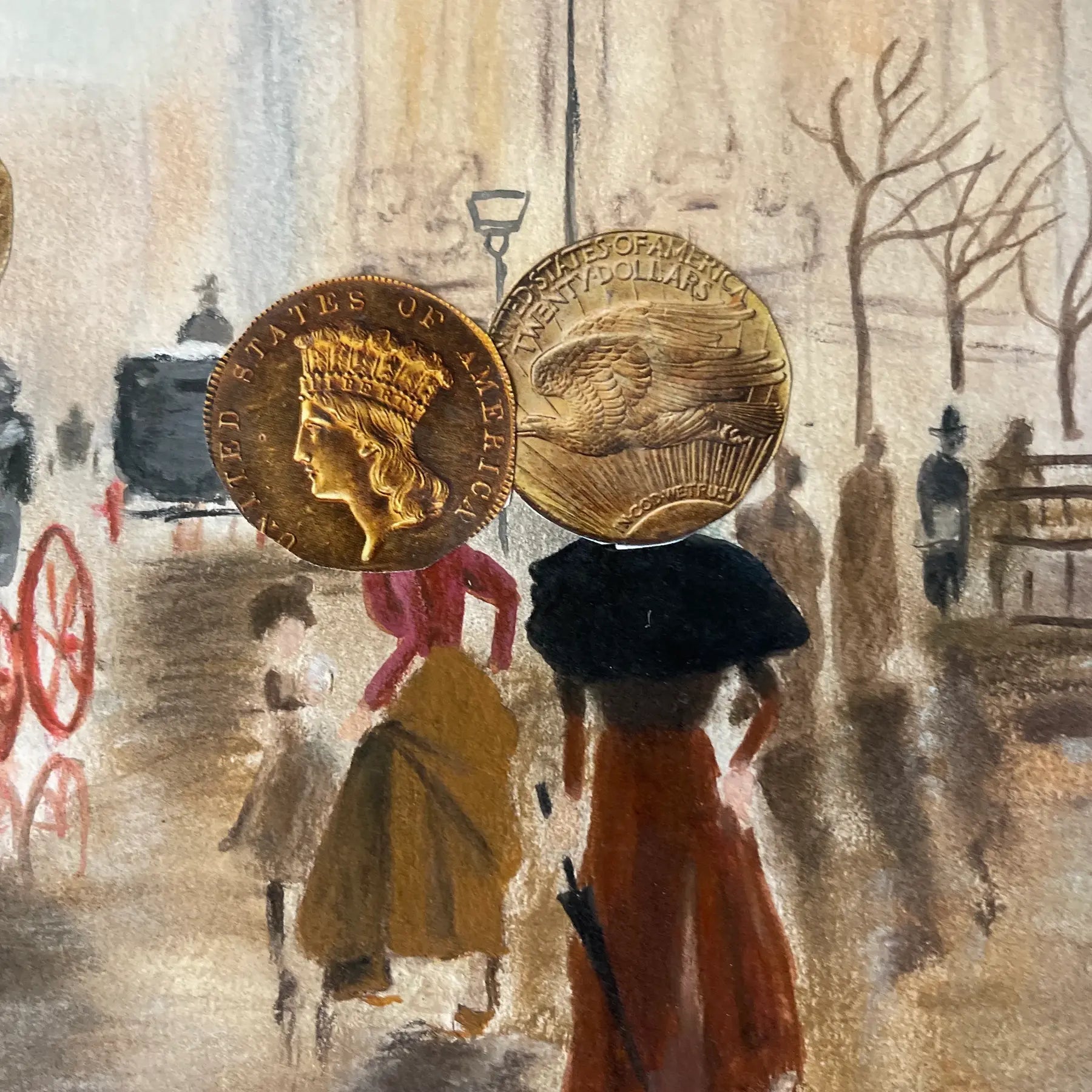 At first glance, it’s a romantic European tableau—but upon closer inspection, the figures’ faces are replaced with coins from around the world. Once symbols of wealth, these currencies now represent faceless individuals in motion—reminding us how tariffs, walls, and closed borders reduce people to politics and profit.